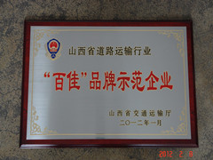 2012年2月8日,在山西省道路運(yùn)輸工作會議上,我公司獲得由山西省交通運(yùn)輸廳頒發(fā)的山西省道路運(yùn)輸行業(yè)《“百佳”品牌示范企業(yè)》榮譽(yù)稱號。